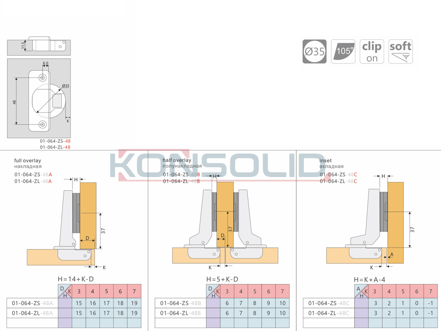 KSLA-064-ZS-48A-4full/48/ 4holes Montaje: superposición completa Ángulo de apertura: 105 ° Tipo de placa: 4 agujeros Peso: 88 gr-92